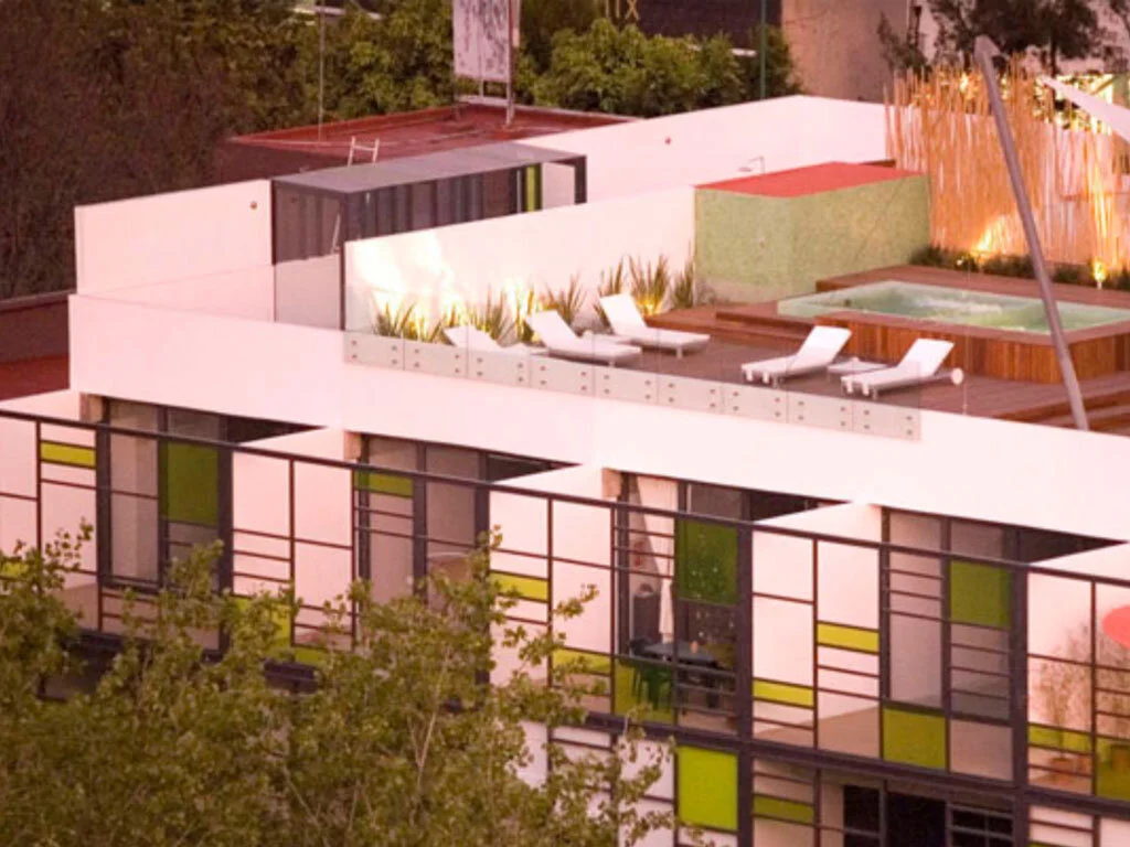 Este complejo consta de 9 unidades habitacionales que cuentan con uno o dos niveles. La fachada principal cuenta con una enredadera (con forro de madera) y hace las veces de un filtro y buffer entre la calle y los interiores.