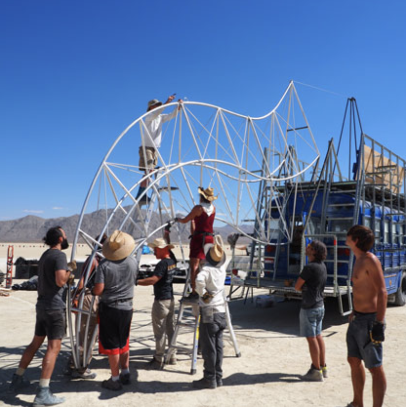 Creada para Burning Man, esta pieza representa una de las figuras más icónicas de la Ciudad de México: el Axolotl. Basados en su capacidad única para regenerarse, el mensaje de esta pieza artística, es hacer lo mismo con los espacios de la ciudad y regenerar los ríos de nuestra urbe. El propósito de esta instalación es funcionar como un espacio para el arte y escenario para eventos musicales.